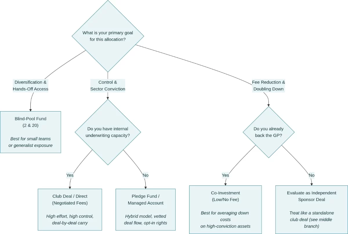 | An institutional LP backs a GP’s flagship fund (2&20) for pipeline access, then targets incremental exposure via co‑invest sleeves with reduced fees/carry to lower blended fee drag on high‑conviction deals. |